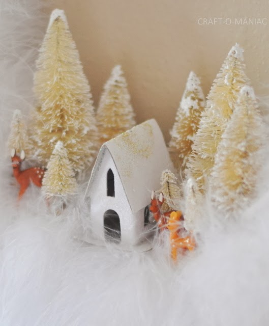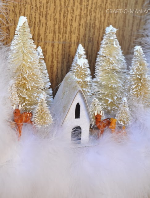 Well I did it!, I mentioned a few posts back that I wanted to make some kind of a feather boa wreath, and I did. YAY! I went out and gathered up some supplies to make my own “Feather Boa” Christmas Wreath. I am calling this wreath “ Winter Wonderland Christmas Wreath.” … a cozy little house tucked up in the winter snowy woods. The cute deer’s in the woods love to gather around the snowed in home that is heated by a nice hot wood burning stove, and a hot crackling fire. The people inside sing Christmas carols around the fire and sip on hot cocoa. OK’ I am officially a dork! Love me anyways please! anyway, that is what I invision when I look at this