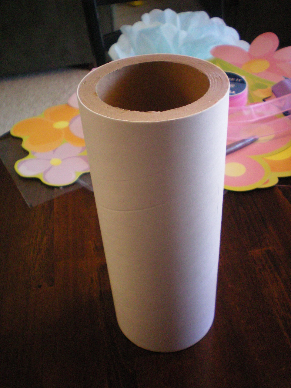 I got this very thick heavy duty photo paper roll from a Photography Studio… YOU can ask the owners if they will sale them to you or if you can have them. My friend showed me THESE emptied photo paper rolls and told me how her friend made a flower arrangement with them for a wedding. I new I could do something with it, so she gave it to me.
