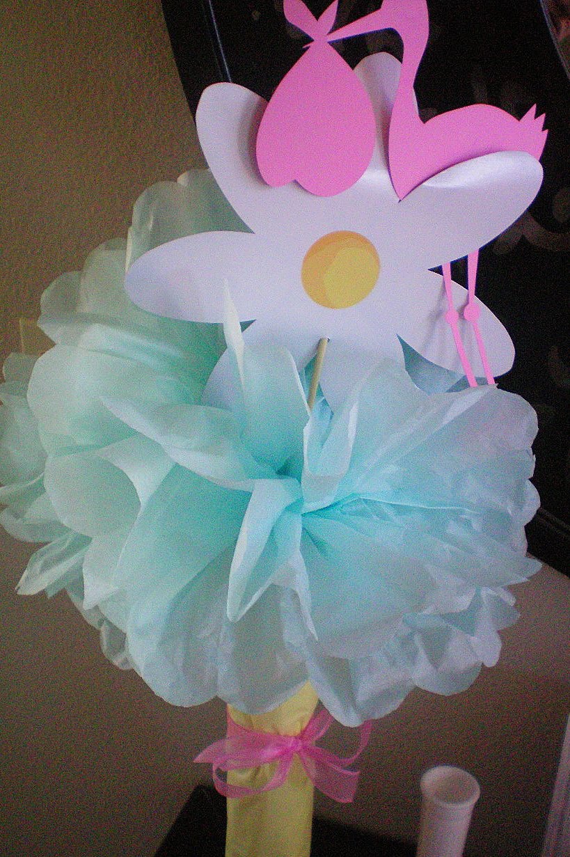 I made tissue balls and tissue ball flower vases for a baby shower I threw this past Saturday. To make the tissue balls you will need to watch the tutorial first. Then once they are made you simply stuff it down in the top of a covered photo paper roll.