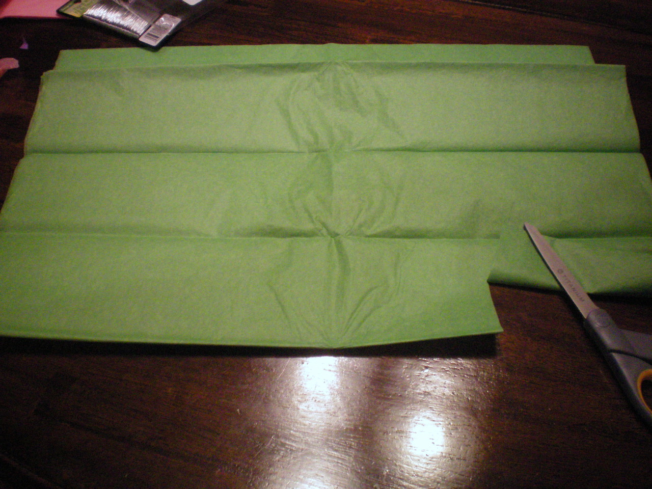 Cover the photo paper roll in tissue paper, by simply rolling the photo paper roll in the tissue paper. Tape or use glue dots to seal it. I didn’t mod podge it on, because I wanted to recycle it again. However, you could mod podge tissue paper or scrap paper to them.