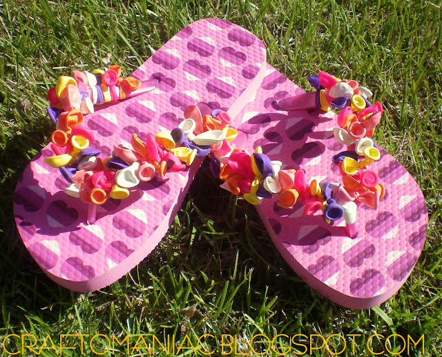 i USED water balloons and of course flip flops. I selected the color scheme I wanted, and then laid out the pattern. I took {34} balloons for EACH flip flop. All you do is tie them on. I place the balloons under the flip flop strap and then tie two knots. THAT IS IT! My pointer fingers hurt now too. 😉