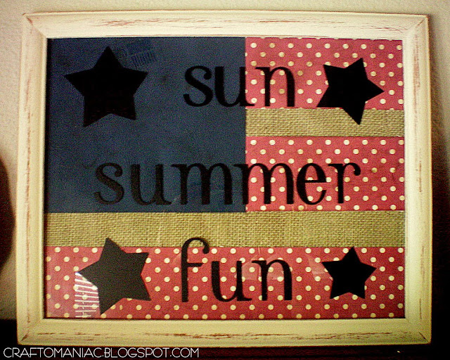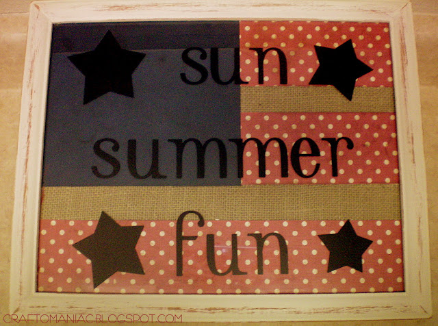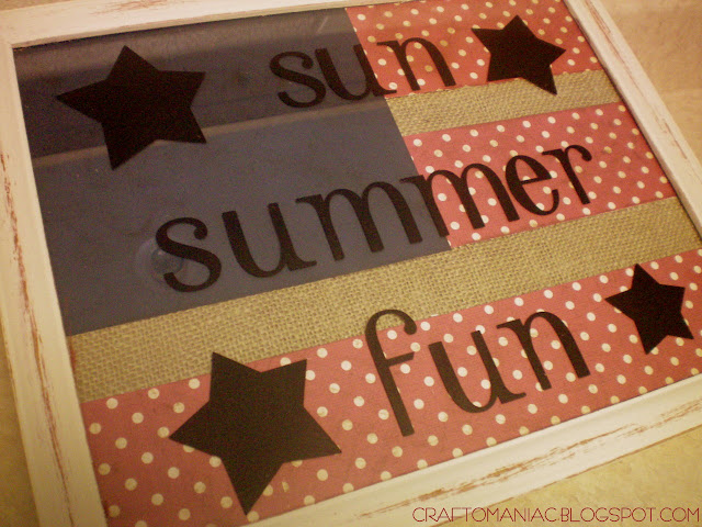 Once you have everything cut, painted, sanded, distressed, glued and placed in the frame, you can add your vinyl to the top of the glass. I used the Platinum School book cartridge that goes to your cricut. You can always do the vinyl first if you choose. Note, this would be just as cute without the vinyl, so if you don’t have a cricut or can’t barrow one, nor have any vinyl. No worries!!! I did go with a summer type saying… So I can keep it out throughout summer not just the 4th!