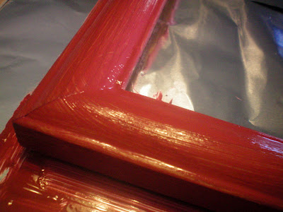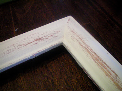HERE IS A HOW TO~ I started this craft by painting the old oak laminate frame with acrylic paint. “burgundy barn red.” Let dry.
