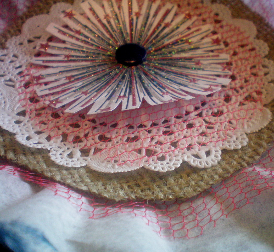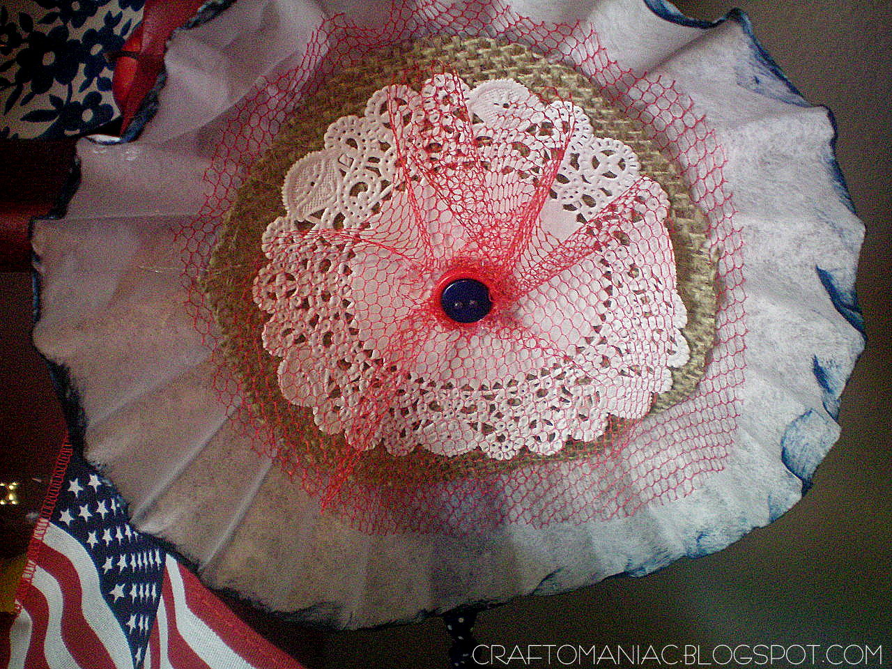 Red mesh, burlap, coffee filters, buttons, 4th of July scrap paper, paper dollies, hot glue gun, navy blue acrylic paint, round small sponge brush, and grow grain ribbon.