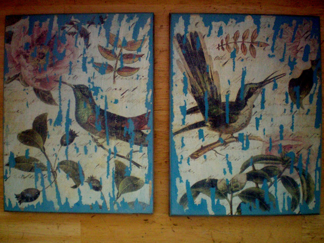 I bought these humming bird plaques forever ago, and wasn’t super thrilled with them, but thought they would look nice in my shabby room. Plus they were a cheap purchase. I tried a DIY…. disaster… HA! by painting them aqua and then sanding it off, HATED IT! SO I DID SOMETHING ELSE…..