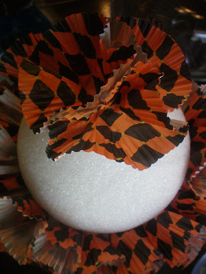 I started hot gluing the cupcake liner’s to the base {FIRST} onto the styrofoam ball. It was easy with it wedged between my knees holding it in place.