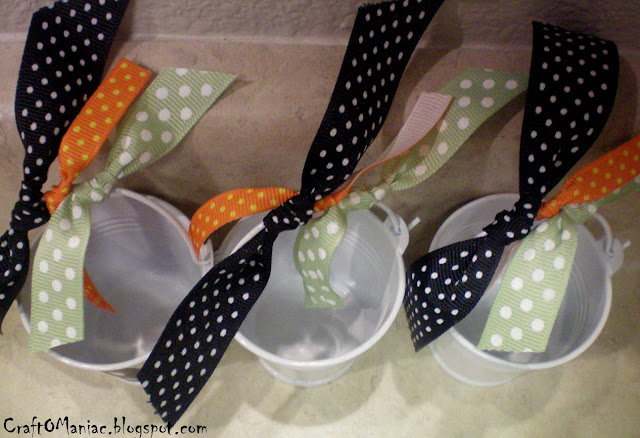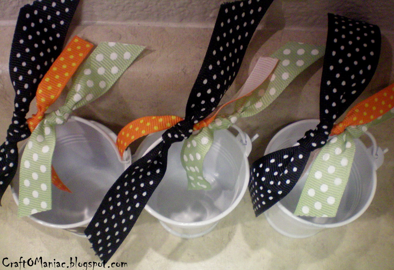 tied polka dot ribbon close shot! HOW CUTE TO PUT the snack size halloween candy in the pails and give these as a gift to your neighbor, friend, teacher, etc.