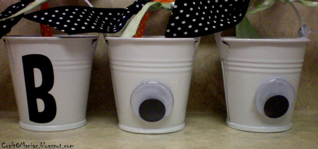 THIS CRAFT COST ME ONE DOL-LAR! {$1~ dollar}! the mini pails came together at the Dollar Tree in a set of three. The ribbon, sticker, and googly eyes I ALL HAD AT HOME. Now I originally planned on black vinyl or black stickers for the {BOO} however, I only had a B in the stickers and NO O’S plus I was all out of black vinyl. I improvised with the Googly Eyes! I have more PAILS AND WILL SHOW YOU MY {HALLOWEEN} ones when I get them done!
