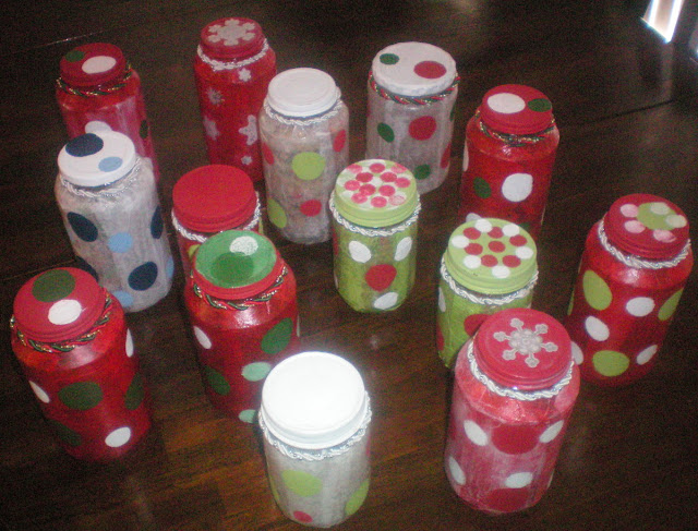 So my sister and I saved and cleaned out our spaghetti, applesauce, jam, etc. jars to decoupage tissue paper onto them. We then painted the lids with acrylic paint and used more acrylic paint to add polka dots to the outside.
