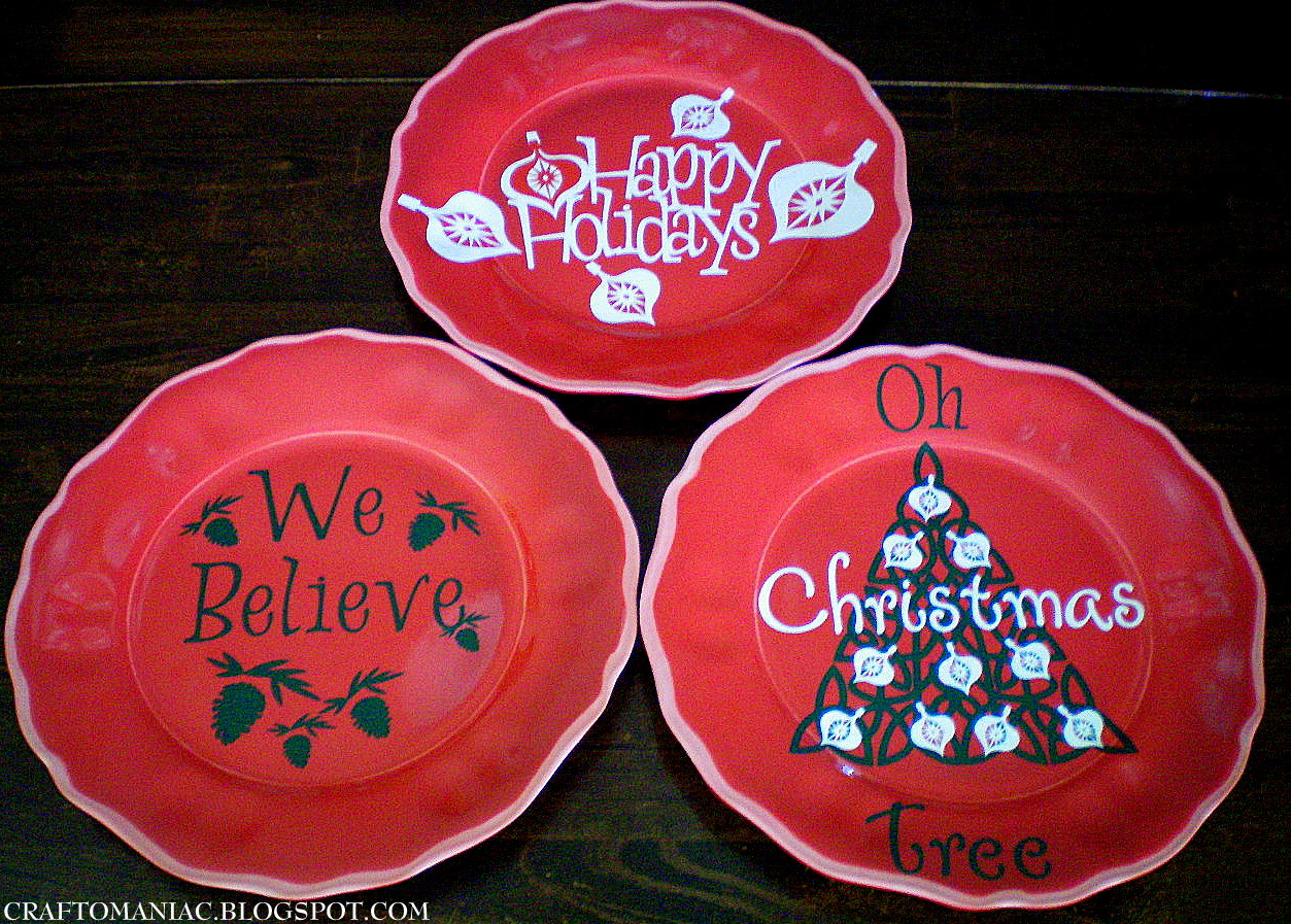 I used white and hunter green Expressions Vinyl and cut out more sayings and prints from my Lyrical Letters Cricut Cartridge and made some fun Christmas Plates. Great for Gifts too and on a cute plate stands.