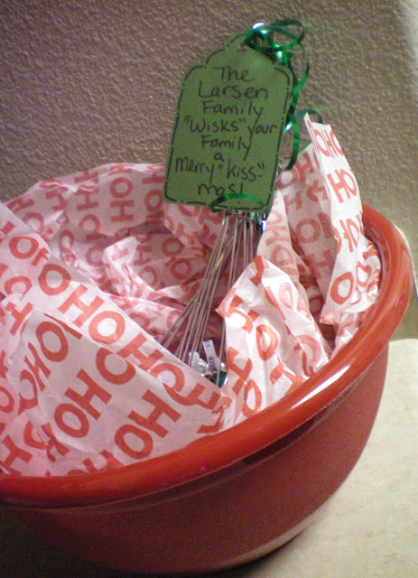 I got all the supplies, minus the tag, paper, and ribbon at Walmart. I found the pack of three wisks as Refresh Reuse and Redo explains, at Walmart for $2.54 I believe. You can do all the wisks or wrap them individually as R.R.R. does. Since I am giving this to a family. I did all the wisks, with a bowl, and a whole bag of Kisses.