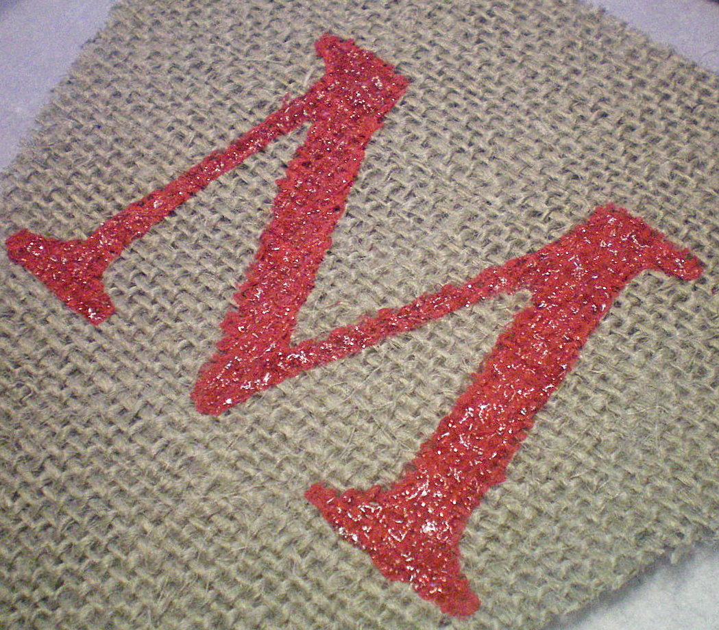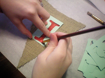 Next letters were cut out using card stock paper, and my Cricut “Platinum Schoolbook” Cartridge. Then my sis carefully stenciled the letters on with red acrylic paint. We tried the glitter glue first, but you need TO paint FIRST, then do the glitter over the top.