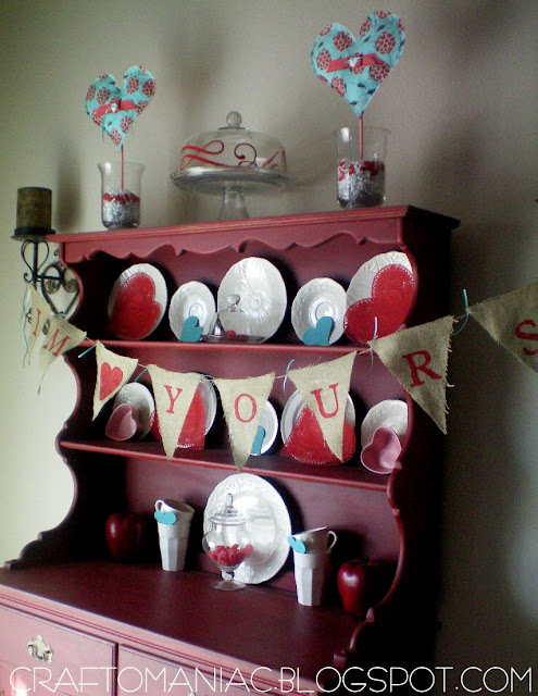 I love all of your valentine decorating, it looks great. I just wanted to share a secret for the painting of the burlap banner. Use freezer paper, it irons right on to the fabric and then when you paint there is no leakage and it just peels right off when dry. Look up tutorials for freezer paper on the internet, it’s awesome stuff.