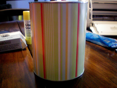 I traced the right length of paper I would need, by using the can as my guide. Then I cut to size. glued on with glue dots and a glue stick.