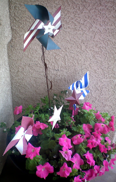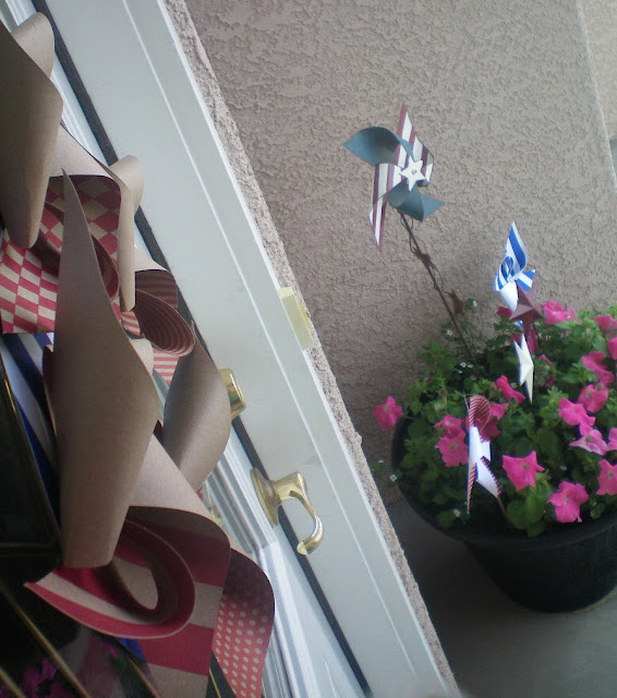 All the paper I used is from the lovely Canvas Corp. and I adore all their paper and products. Today I worked on a “Patriotic Pinwheel Wreath.” Super easy. I used two super thick pieces of card stock glued together for the circle and then made the pinwheels. I also made two pinwheels and hot glued dowels to the backs of them to stick in my flower pot.