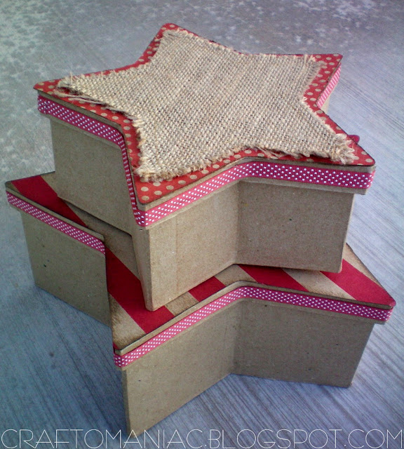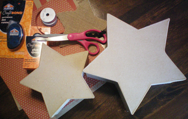 I had fun embellishing these simple cute star boxes.They took hardly any time at all. The Paper, and Burlap Star are from my sponsor Canvas Corp. The cute small box star and medium box star are from Roberts Crafts along with the polka dot ribbon. I used my Elmer’s Dot Runner to adhere the cut out stars to the box lids.