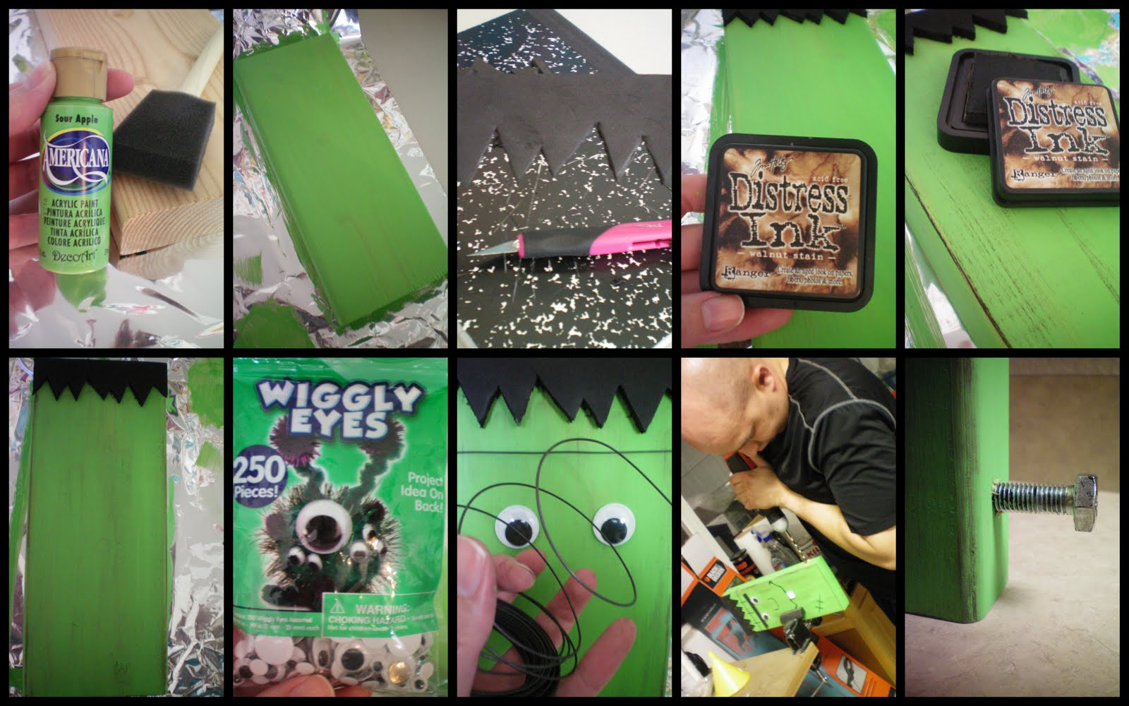 I thought of this project when I saw some chunky Hex Bolts on my hubbies tool bench. HA! I went to Home Depot and picked a large board out of their scrap wood and had a guy cut it for me at 13 inches. I got the piece of wood for 50 cents. Craft stores should carry wood too, but if you want it bigger I say Home Depot or Lowes. I also bought 2 hex bolts (because hubbies were different sizes) I picked up apple green acrylic paint and black acrylic paint as well as googly eyes at Roberts Crafts. All of the other products I used, are ones I had at home.