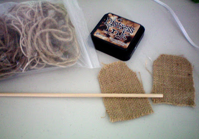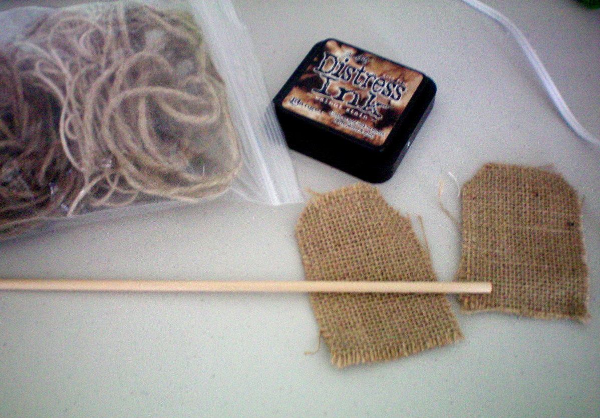 I made the witch broom with stuff I had at home. The broom brissels are made from two Canvas Corp. burlap tags. I then used a dowel distressed with walnut ink and glued the burlap back to back, cut strips, and glued small twine around the broom.