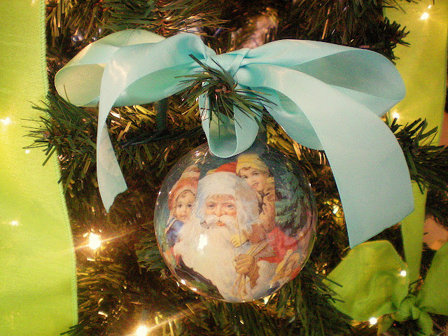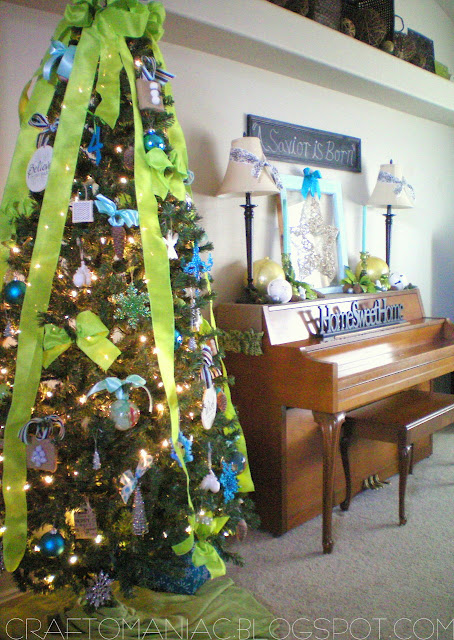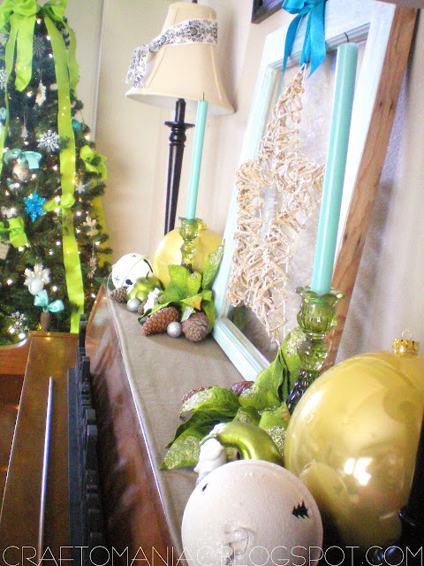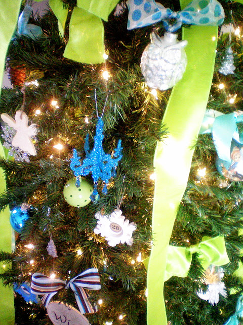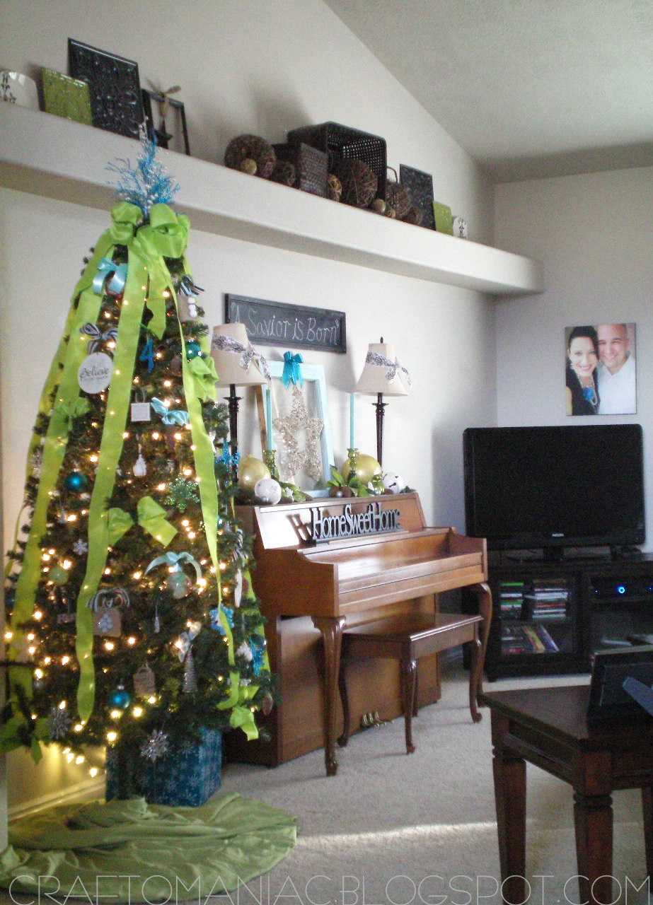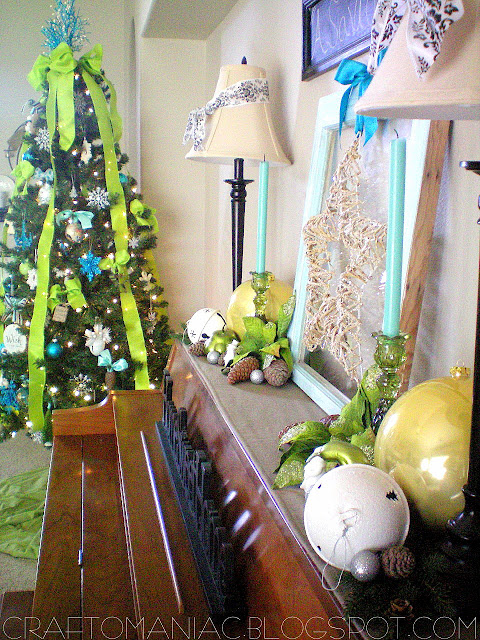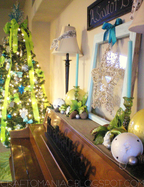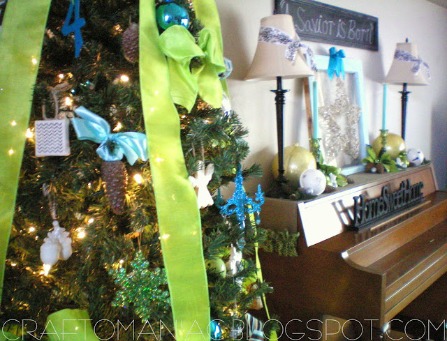 This year I went for something totally different from the Traditional Red and Green I normally decorate in. I love the traditional colors but since I added chartreuse green and turquoise this year to my home decor, I wanted to stick with those same colors. A lot of the ornies I made too, or I added big ribbon to existing ones I had to give them a fresh new look.