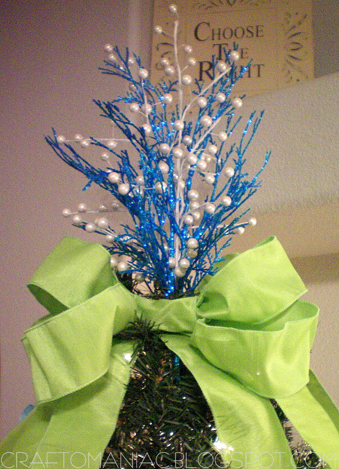 berry twigs and glittery turq. branches are from Michaels Crafts. The green wire ribbon is from Tai Pan Trading.