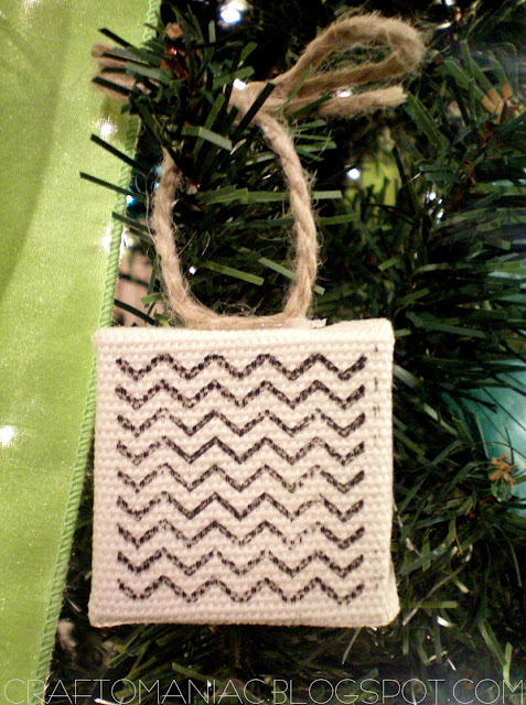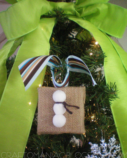 I also made this snowman orn. I hot glued 3 white cotton balls to the Canvas Corp burlap canvas, added some brown waxed cotton as the scarf and hot glued the striped ribbon to the top.