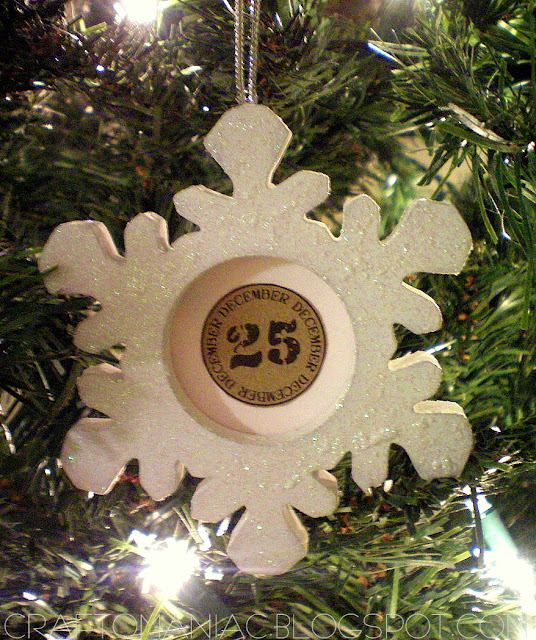 I made this orn. by adding a circle cut Canvas Corp. Christmas paper, and gluing it to the back of the snowflake orn. The orn is from the $1.00 section at Target.