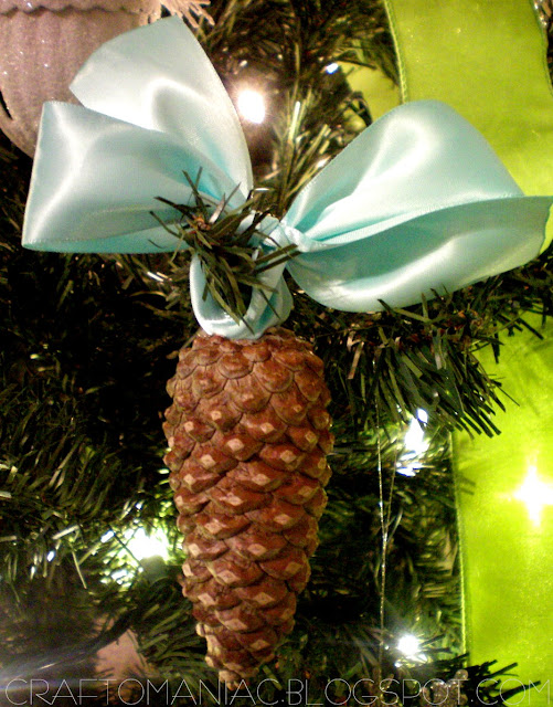 another orn. I made by hot gluing ribbon to the top of some pine cones I picked off my backyard tree.