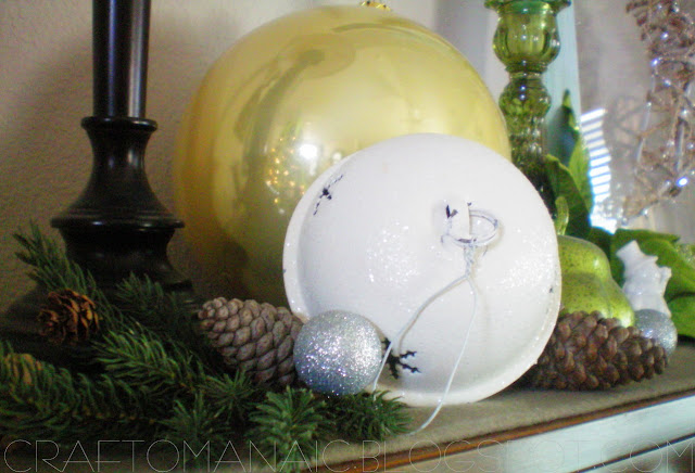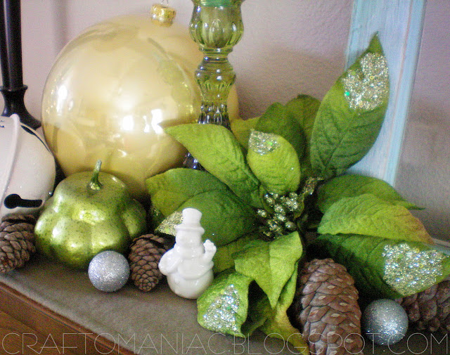 On the Piano- The large bulbs are from Tai Pan (last year) the poinsettias are from Michael’s, the green pumpkins are from Walmart during Nov. The big white bells are from Tai Pan (last year) the mini snowman and mini santa are from Ace Hardware. The wicker glittery star is from Pier 1. The green pine tree sticks with acorns are from Roberts Crafts (last year) The small silver glittery bulbs are from Roberts Crafts, and the pine cones are from my tree in the back yard.