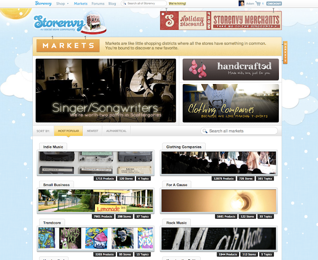 2) Built in Marketplace We wanted to make it easy for store owners and shoppers to find each other. The Storenvy Marketplace does just this by showing off products from all of our Storenvy stores in one easy place to shop and discover. Storenvy storeowners receive on average 15% of their sales through the marketplace.