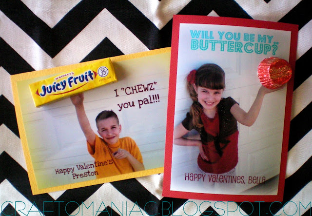 Anyway, I took the pictures of the kids posing them just so. Then I edited them in Picnik and added the text. I uploaded 50 pictures, 25 a piece- to Costco costing $6.78 bought the card stock, gum (found at Walmart), and Reese’s. Then with some cutting, gluing, and glue dotting I put the cards together.