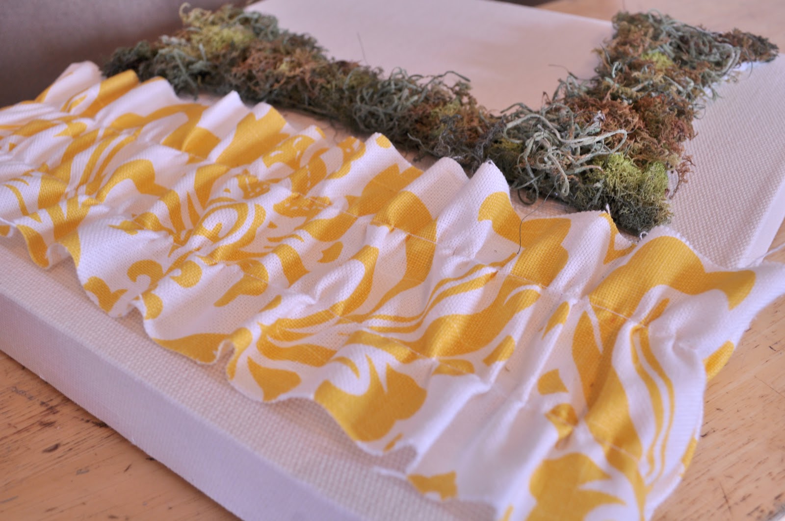 I started with a cute piece of yellow damask fabric I ordered from fabric.com. I sewed/ruffled the fabric in two places down the cut fabric.