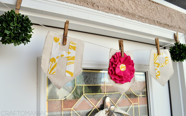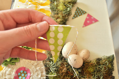 Next I added some cute canvas flowers from Canvas Corp. that I hot glued down. I cut out some pennant shapes and some circles for the center of the canvas flowers. I hot glued down the the pennant banner and I was done.