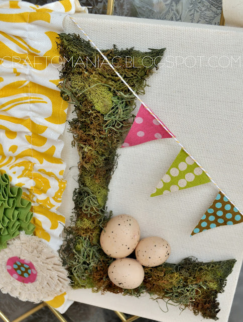 Next I hot glued down some eggs I had on top of a letter “L” I made early last spring. The “L” is made from tracing a letter onto styrofoam board, cutting it out, spray painting it green, and hot gluing down a few different choices of moss.