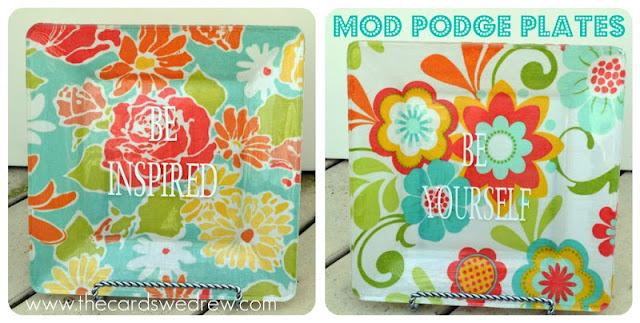 These plates can be used for so many different things…plate walls/home decor, chargers for dinnerware, menu boards for next to your stove (with dry erase marker), jewelry holders, and much more. You could mod podge bowls even!! ALSO–MOST IMPORTANTLY…YOU CANNOT WASH THESE PLATES. THEY CANNOT GET TOO WET (lightly wash off with semi-damp rag if needed), so please be sure to find uses for these that do not involve needing washed (sorry to burst your bubbles!). Hope you enjoy them and be sure to share your mod podge plate creations with me over at The Cards We Drew!! And HUGE thanks to Plaid for sending me some Mod Podge to try out on this project!!!!