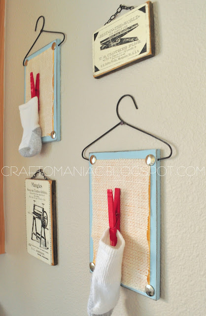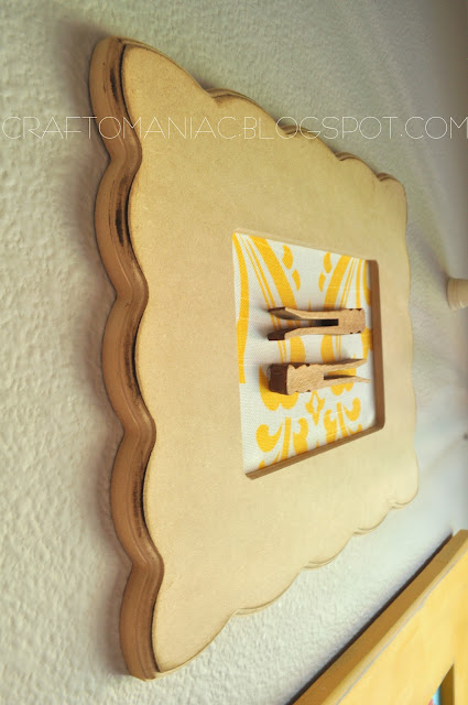 and here is my other new addition my Cut It Out frame. I just added a stain around the edges. Hot glued fabric around the inside board, and hot glued down two antique clothes line pins. EASY!