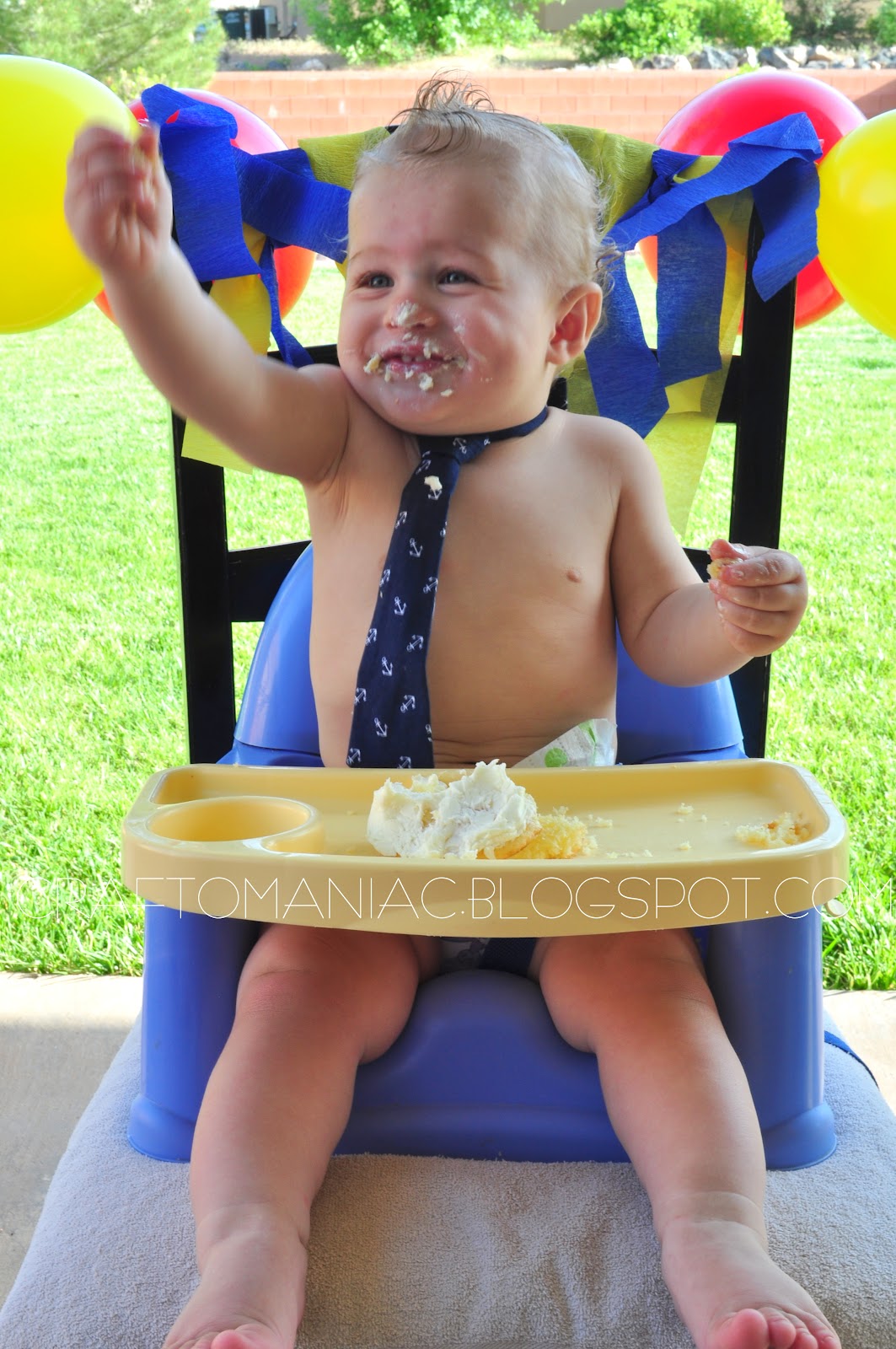 Ok, how sweet is he in that tie w/ a face full of cake!! Makes me want to eat him up! He is so cute!! What a fun birthday, full of great little goodies! I love all your decorations and food choices and snacks! Super Job MOM! Adorable!!