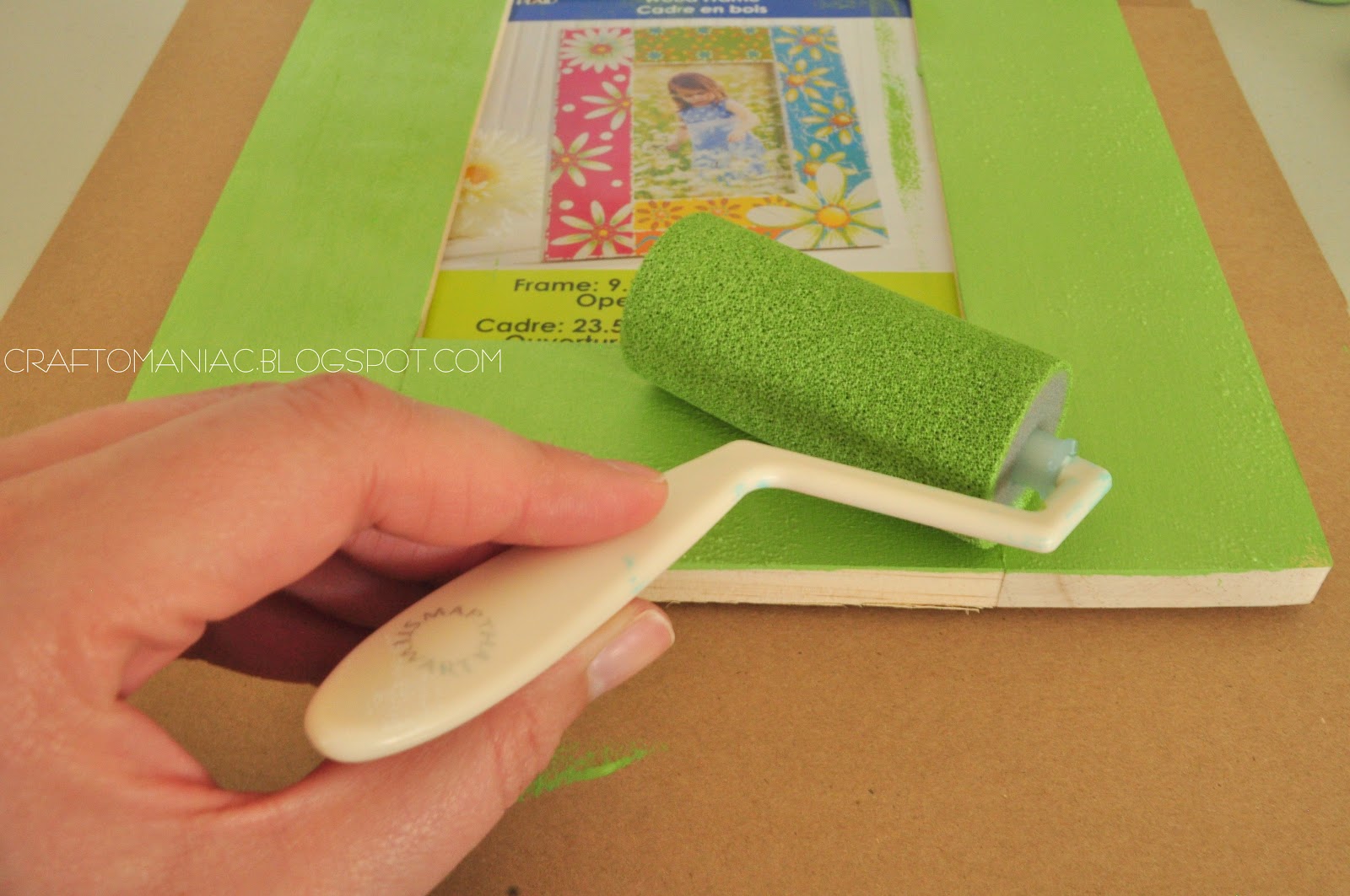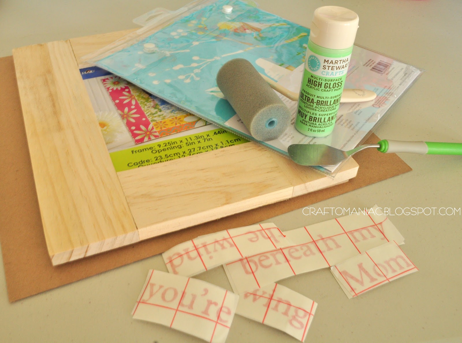 I used my Martha Stewart rolling pin for painting the Plaid craft frame I got at Walmart. I used 3 different Martha Stewart paints to complete the project. The green paint was mixed with another shade of green paint I had, along with a green Martha Stewart paint. I cut out vinyl and painted over it, then when the paint was all dry I carefully peeled off the vinyl. I Stenciled the bird and branch with one of my Martha Stewart stencils, and mixed two Martha Stewart pink paints to create the blossoms on the stenciled tree.