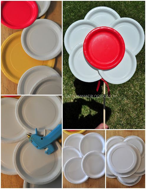 PAPER PLATE FLOWER– One large paper plate, five small paper plates, and one opposite colored plate for the center. Hot glue all five plates around onto the large paper plate. Finish with the centered paper plate. Hot glue a wood dowel to the back, and add ribbon if you choose.