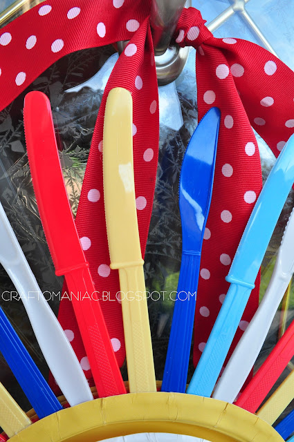 HOW TOO: Start with your knives and three paper plates. Set your knives aside, and hot glue together your three paper plates. Flip your glued paper plates over and trace the plate onto felt. Cut out the felt and hot glue it to the top of the plates. Your knives will not glue to the plate, trust me I know I learned the hard way. With the felt it worked GREAT! Next start hot gluing down your knives in the pattern you have chosen. I got all my plastic knives at Walmart in the party section. Each package was .99 cents. After you have glued down all your knives hot glue down another paper plate on top of the felt. Do this in a color you choose. Color side up! Then take a smaller paper plate and glue that to the top center. Again colored side up. Flip the wreath over and hot glue down some ribbon. Then to give the back a finished clean look hot glue down another paper plate over the glued ribbon. Back side up. You are now ALL FINISHED. This wreath is pretty heavy once its all done, so wind shouldn’t be any problem. You can make this summer time sunburst wreath in just about any color you choose.