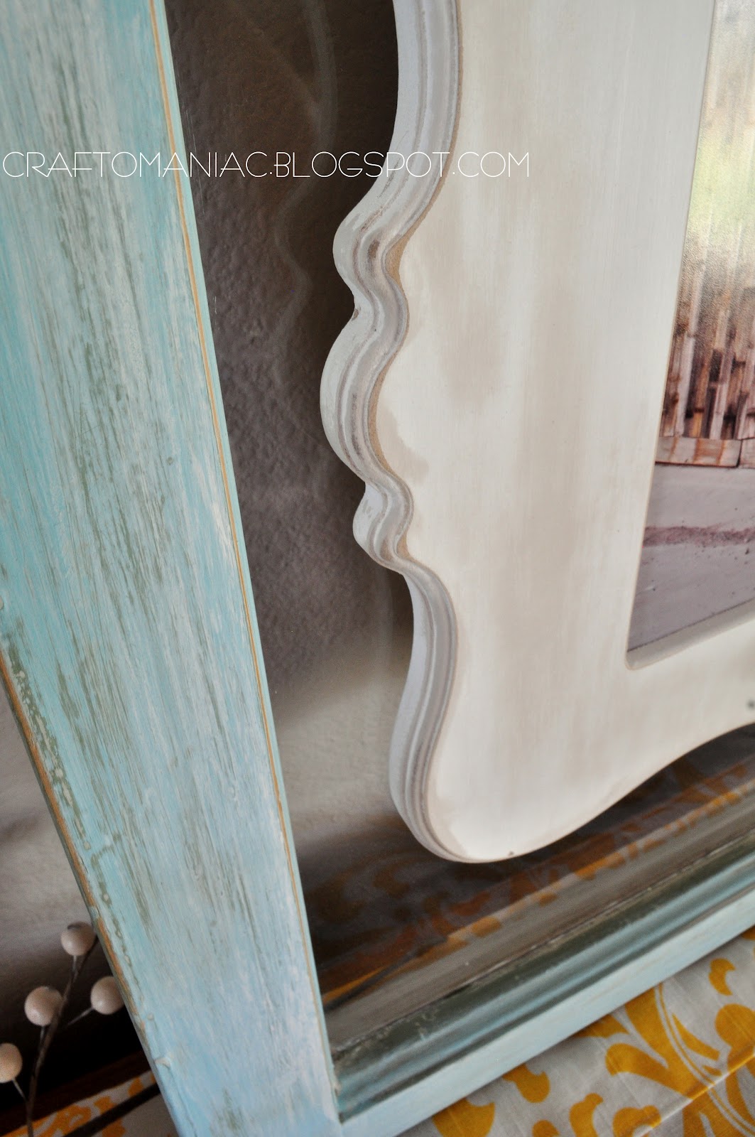 The cut it out frame I painted first with a dark wood stain. Then I lightly painted over it with a white acrylic paint. Once it was all dry, I sanded the edges where I wanted, and lastly cut some fabric that I hot glued to the back for hanging on the old window.