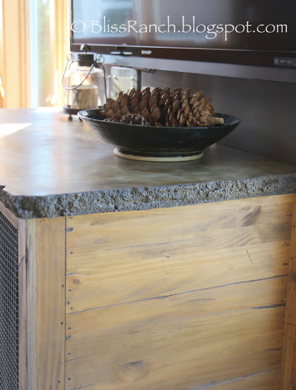 My husband, who I call Brawn, (because I’m the brains of the operation and he’s the muscle) decided to use the old wood from the tall cabinet to make a short cabinet and do a poured concrete top with a rough edge for a rustic look.