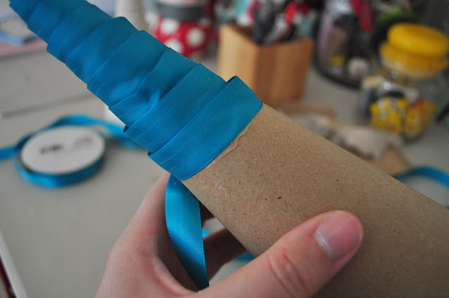 For the large brown cone I hot glued satin ribbon flipped over to expose the dull side. I simply added my hot glue and wrapped the ribbon all the way around until it was finished.