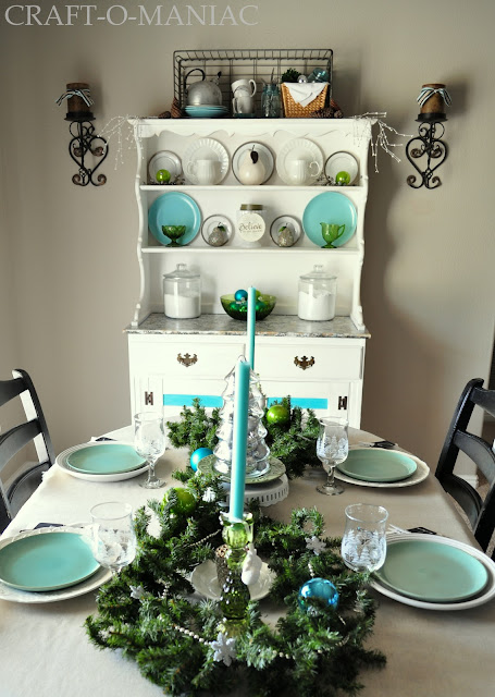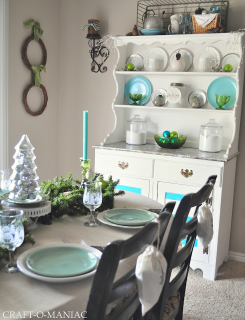 Today I am sharing my “Holiday Tablescape and Hutch.” I was very honored when a local S. Utah Magazine Elan Woman emailed me and asked if I would like to be featured in their “Holiday” issue of their magazine? OH’ BOY WOULD I!!! It was October when I got the email, so I got busy and I took down all my Fall/Halloween stuff. I Decked The Halls creating a clean, soft-with a punch of color tablescape. I love decorating my home, but I especially love doing it around my FAVORITE holidays… and Christmas is certainly one of them. My colors I chose are soft naturals with natural like elements, soft turquoise, and chartreuse green.