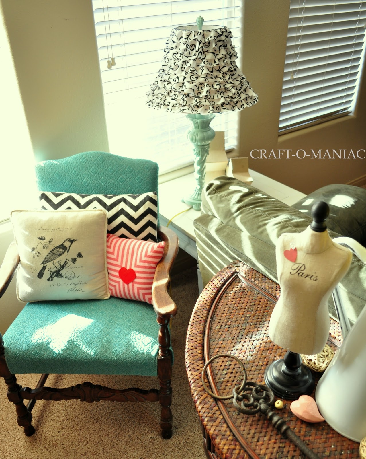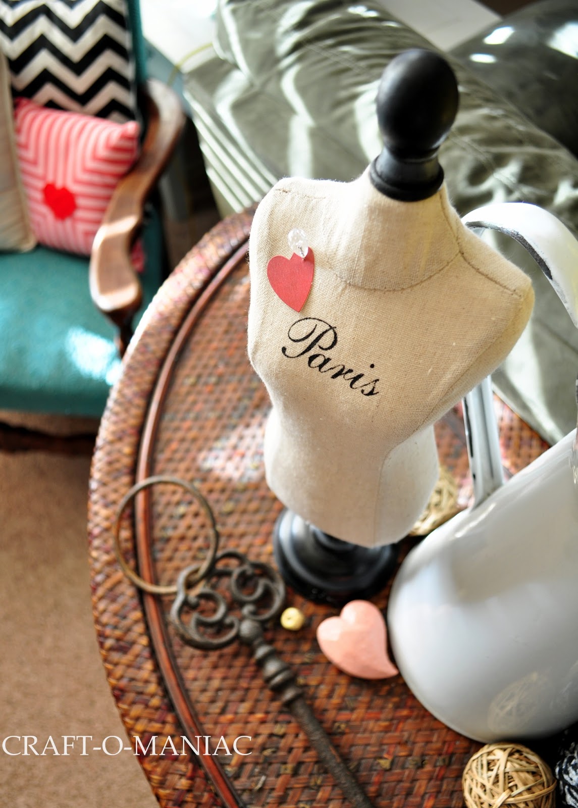 The cute pink striped heart centered pillow I got at Target and the Paris mannequin I got at HomeGoods.