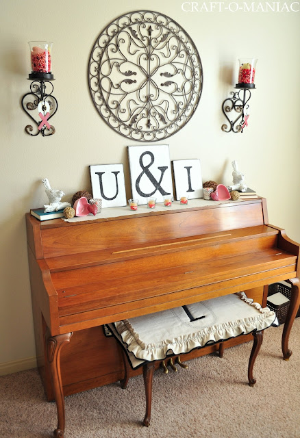 I am sharing my always changing Piano.Winks! I realize you all see the same pieces, but I try to decorate them differently. Some of the items you may recognize from previous posts in the past, but the items are used in different spots and spaces. My U & I Type Writer Canvas Art I made two years ago and you can find them here. This year I added them to my piano, keeping the theme pretty clean and simple.