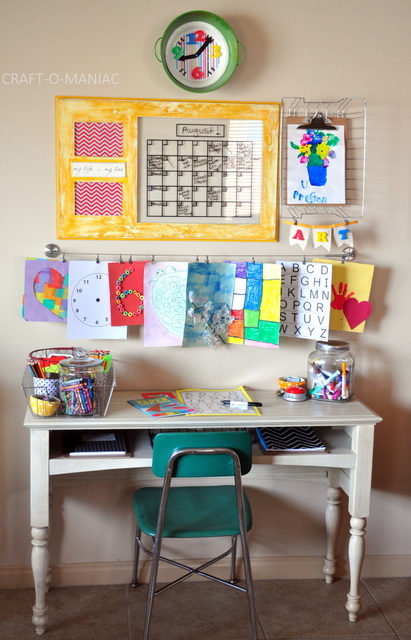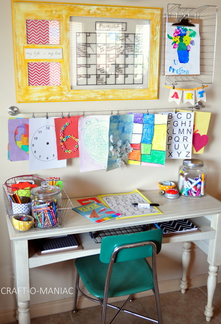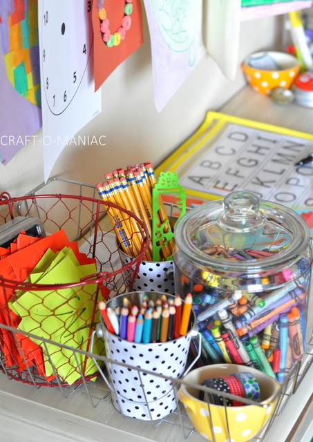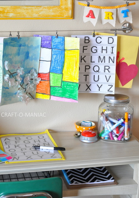 This is AWESOME!! I can’t wait until my little ones are old enough to utilize something like this. I love the colors and the wire basket that you used to display art work. Great job!