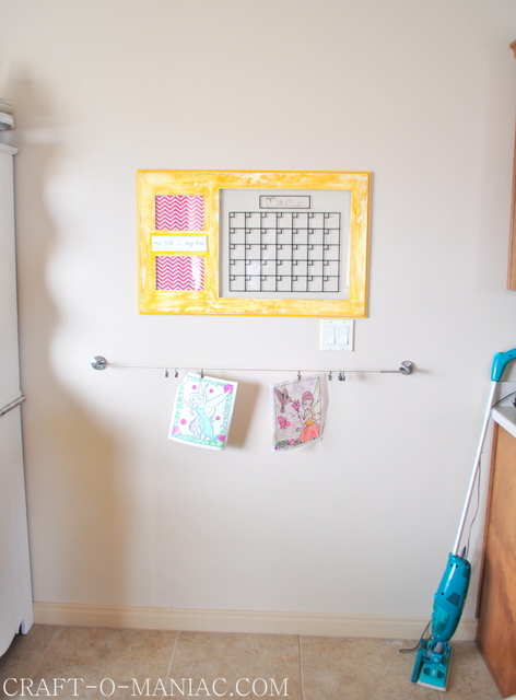 You see I had this DEAD space between where my counter and cupboards end in my kitchen and where my white hutch sits on the other side/end. This space has been driving me bonkers. I wanted to do a fun plate wall with a bench, but I had this cute dry erase calender that I painted and sanded yellow that I wanted to use as well. I figured the plate wall can come later when all my kids are grown out of this. winks. So I stared at this space and stared and thought Oh’ I could use my cute IKEA art display I purchased, but the space was still majorly lacking….