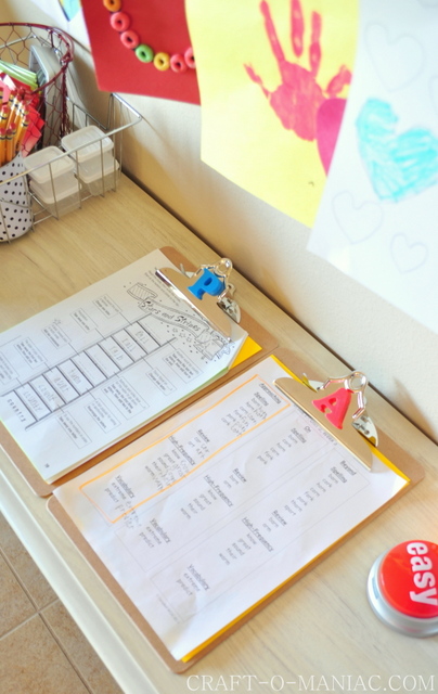 I used two more clipboards for both Preston and Arabella’s homework and or spelling words. Both their homework and spelling words stay on the clipboards until they complete their homework and have studied enough of their spelling words. When they are done with their homework they get to hit the “easy” button alerting me that they are finished… and it’s their favorite part.