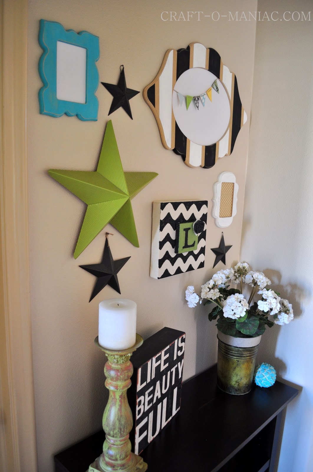 Well the cute “Life is Beauty-ful” sign is new and I got it a month or so ago. I also picked up the green candlestick that was thrifted for $2.00 bucks and the cute turquoise balls were also thrifted for $2.00 bucks. I have moved the turquoise balls and the sign around the most… but.. today I finally found their homes. I love this “Star and Frame Gallery Wall” because its colorful, fun, and it has texture. Plus its the last wall people see when they leave my house.