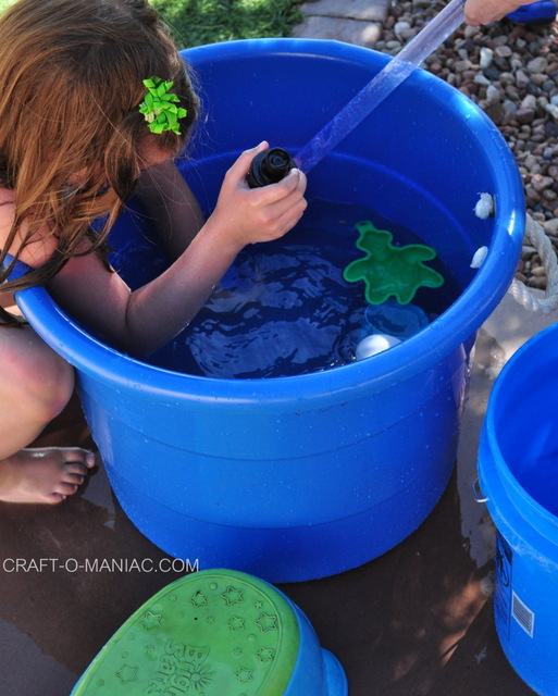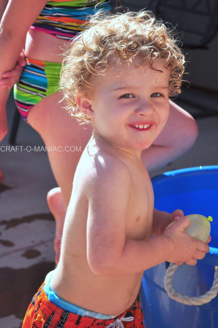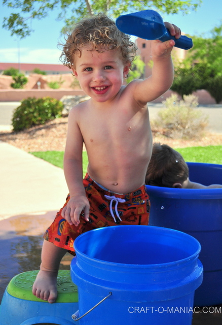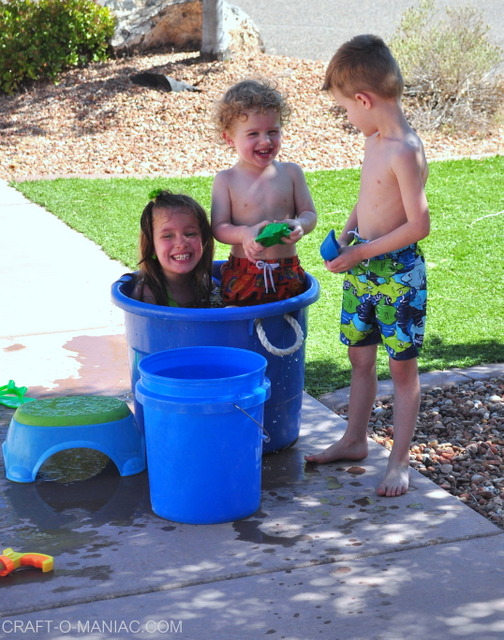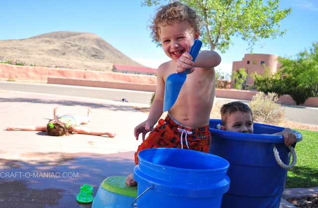 You don’t have to go to the pool, a water park, or even the wet pad to have a super fun ” Totally Free Kids Water Day!” (you know- don’t drive car, don’t spend money on gas!) I know this isn’t rocket science.. but I just took some buckets filled them with water, added plastic molds, cups, shovels, squirt bottles, and even some water squirter’s and my kids went nuts. I really wanted my oldest son to get involved and to get him pulled away from mine craft, so the good Ol’ hubs pulled out Preston’s water balloons he won in school.. and then it was “Water War” ON! and my oldest son changed into his suit and the extra fun began.